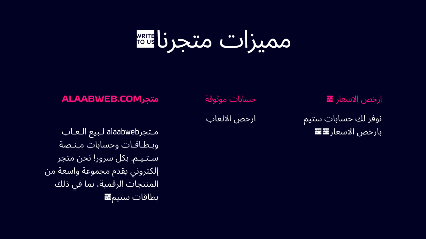 مـتجرalaabweb لـبيع الـعـاب وبـطـاقـات وحسابات مـنـصة سـتـيـم. بكل سرور! نحن متجر إلكتروني يقدم مجموعة واسعة من المنتجات الرقمية، بما في ذلك بطاقات ستيم و العاب الفيديو الرقمية. يسعى فريقنا باستمرار